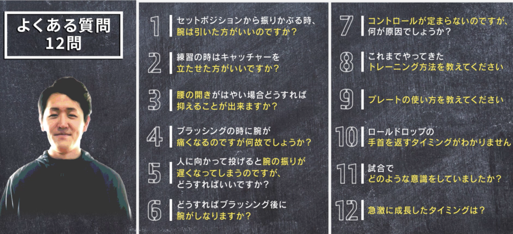 チームにピッチャーがいなかったため、自己流でウインドミルを練習していましたが、ブラッシングの時に、腕が当たりすぎて痛くコントロールがノーコンすぎて悩んでいました。。。。しかし、指導者もいなくどうしたらいいのか分からず試行錯誤していた時に見つけたのがこの教材でした。腕の痛みもコントロールも身体の開きが原因だと気がついて、教材の通りに練習したところコントロールが以前よりもかなり安定して思ったところにストライクが入るようになりました!!コントロールが安定してきたので、今は変化球とスピードアップにチャレンジしています!